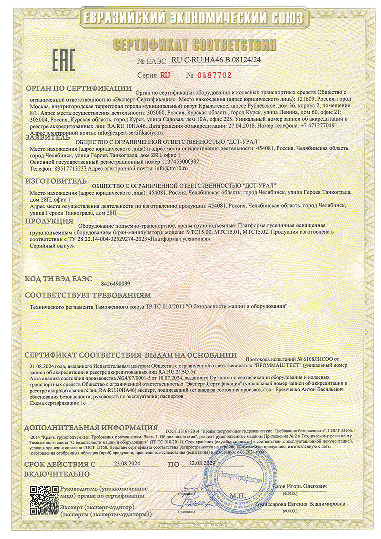 Сертификат Платформа гусеничная МТС15.01, МТС15.02