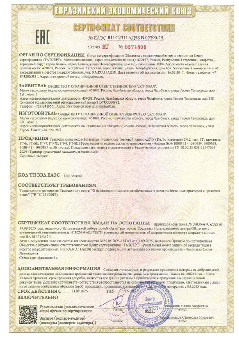 Сертификат Сельскохозяйственный трактор FT